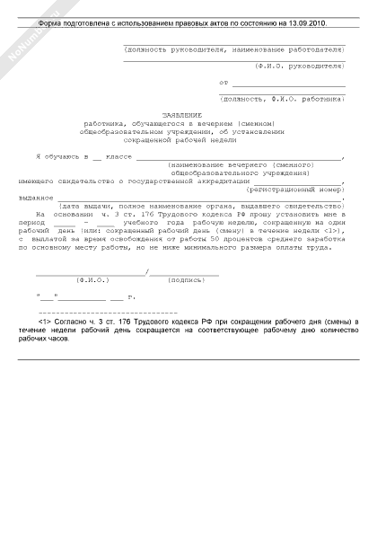 - 2841Заявление работника, обучающегося по очно-заочной (вечерней) и заочной формам обучения в имеющем государственную аккредитацию образовательном учреждении среднего профессионального образования, об установлении сокращенной рабочей недели