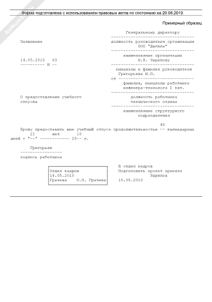 - 2843Заявление работника, успешно обучающегося в имеющем государственную аккредитацию образовательном учреждении начального профессионального образования, о предоставлении дополнительного отпуска с сохранением среднего заработка для сдачи экзаменов