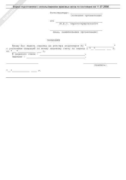 - 2855Заявление регистратору от зарегистрированного лица с требованием о выдаче справки об операциях по лицевому счету