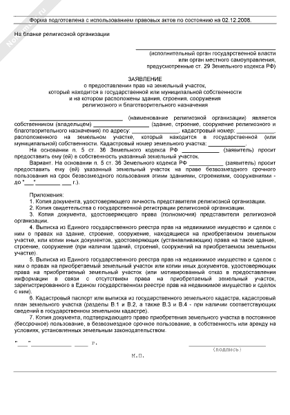 - 2856Заявление религиозной организации о предоставлении прав на земельный участок, который находится в государственной или муниципальной собственности, и на котором расположены здания, строения, сооружения религиозного и благотворительного назначения