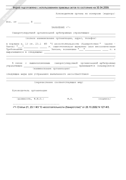 - 2871Заявление саморегулируемой организации арбитражных управляющих о невыполнении ею требований, являющихся основанием для включения сведений о ней в единый государственный реестр саморегулируемых организаций