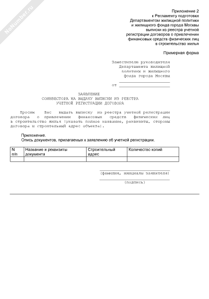 - 2878Заявление соинвестора на выдачу выписки из реестра учетной регистрации договора о привлечении финансовых средств физических лиц в строительство жилья в городе Москве