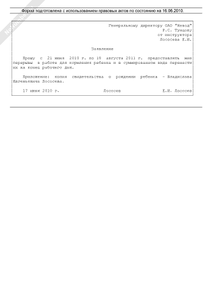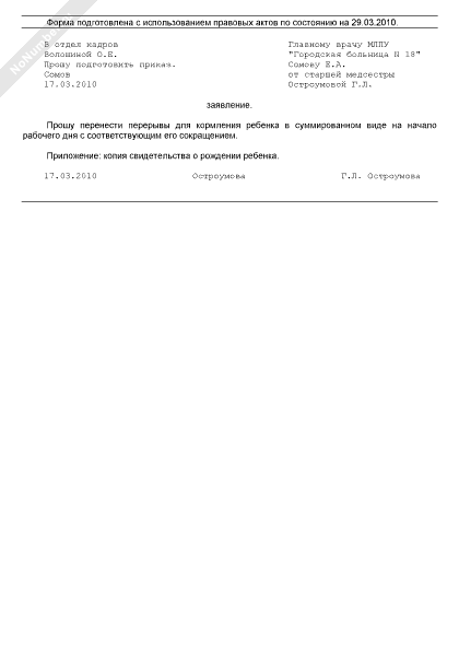 - 2892Заявление сотрудницы о переносе перерывов для кормления ребенка в суммированном виде на начало рабочего дня с соответствующим его сокращением