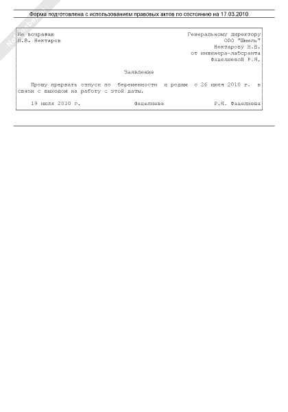 - 2891Заявление сотрудницы о прекращении отпуска по беременности и родам в связи с выходом на работу