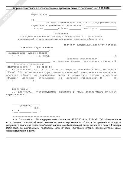 - 2900Заявление страхователя о досрочном отказе от договора обязательного страхования гражданской ответственности владельца опасного объекта