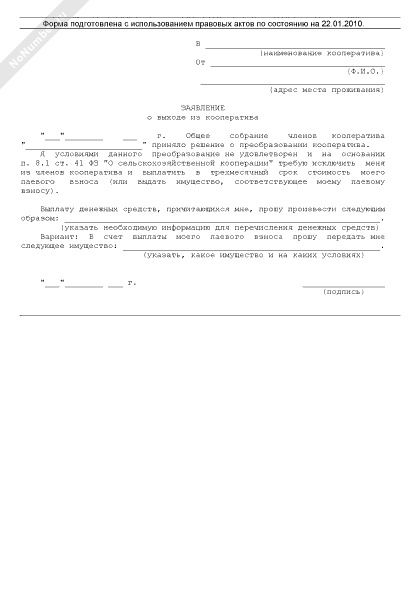 - 2961Заявление члена производственного кооператива (ассоциированного члена производственного кооператива), который не удовлетворен условиями преобразования производственного кооператива, о выходе из кооператива