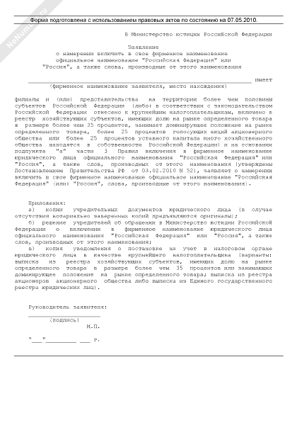 - 2977Заявление юридического лица о намерении включить в свое фирменное наименование официальное наименование «Российская Федерация» или «Россия», а также слова, производные от этого наименования