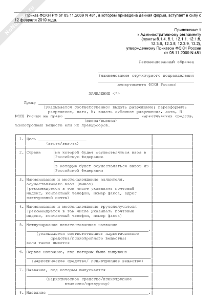 - 2976Заявление юридического лица о выдаче разрешения Федеральной службой Российской Федерации по контролю за оборотом наркотиков на право ввоза (вывоза) наркотических средств, психотропных веществ или их прекурсоров