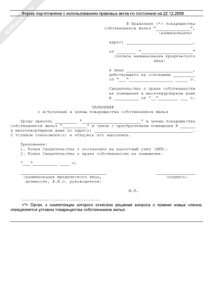 - 2969Заявление юридического лица — собственника помещения в многоквартирном доме о вступлении в члены товарищества собственников жилья