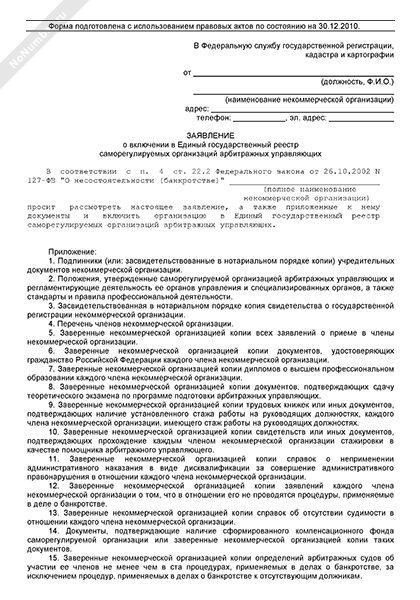 - 3067Заявление некоммерческой организации о включении в Единый государственный реестр саморегулируемых организаций арбитражных управляющих