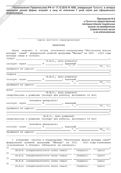 - 3070Заявление о включении в состав участников подпрограммы «Обеспечение жильем молодых семей» федеральной целевой программы «Жилище» на 2011 - 2015 годы