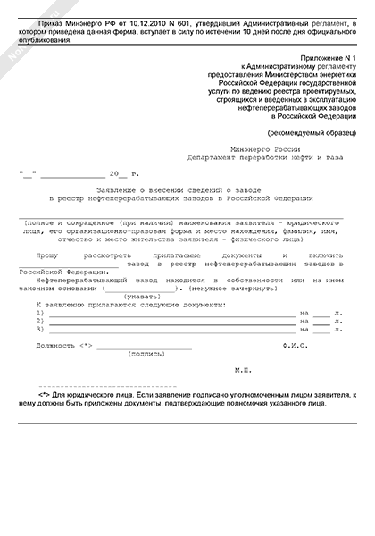 - 3073Заявление о внесении сведений о заводе в реестр нефтеперерабатывающих заводов в Российской Федерации