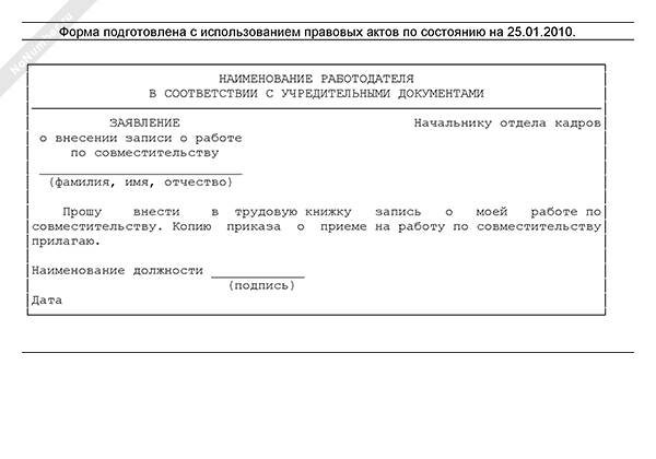 - 3072Заявление о внесении в трудовую книжку записи о работе по совместительству