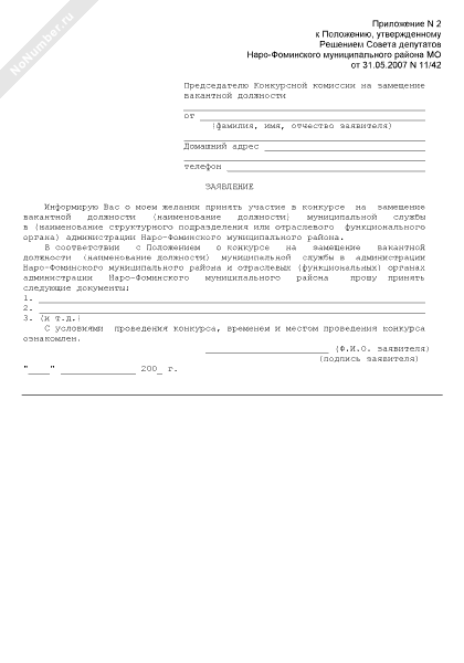 - 351Заявление гражданина (кандидата), изъявившего желание участвовать в конкурсе на замещение вакантной должности муниципальной службы в Наро-Фоминском муниципальном районе МО
