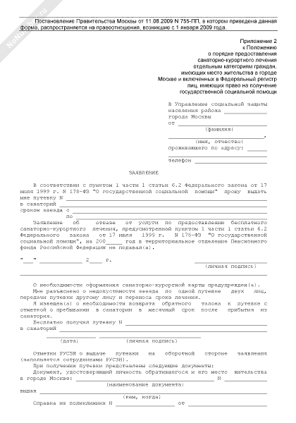 - 358Заявление гражданина, имеющего право на получение государственной социальной помощи в Управление социальной защиты населения города Москвы, о постановке на учет для получения санаторно-курортной путевки в санаторий в соответствии с рекомендуемым профилем лечения согласно медицинскому заключению