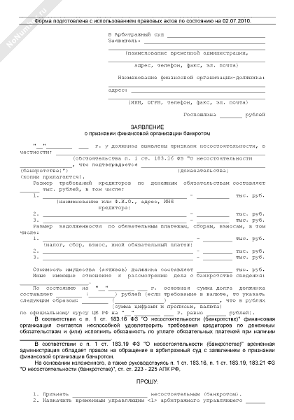 - 342Заявление временной администрации о признании финансовой организации банкротом