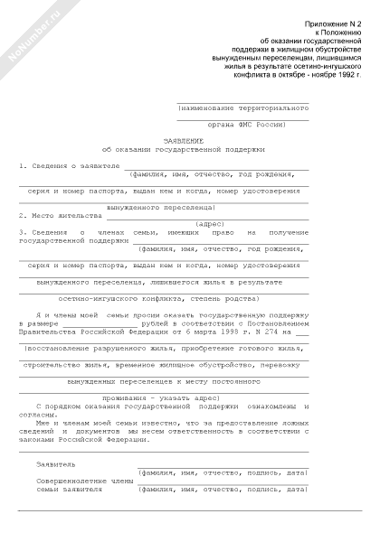 - 345Заявление вынужденного переселенца, лишившегося жилья в результате осетино-ингушского конфликта, об оказании ему государственной поддержки