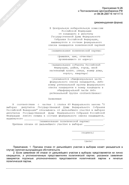 - 522Заявление кандидата об отказе от дальнейшего участия в выборах депутатов Государственной Думы Федерального Собрания Российской Федерации пятого созыва в составе федерального списка кандидатов политической партии