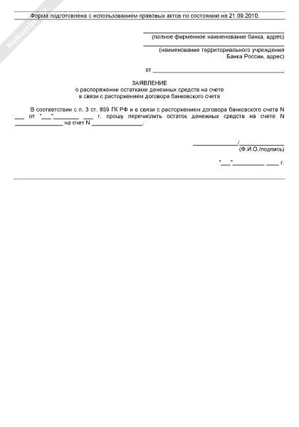 - 530Заявление клиента в банк о распоряжении остатками денежных средств на счете в связи с расторжением договора банковского счета