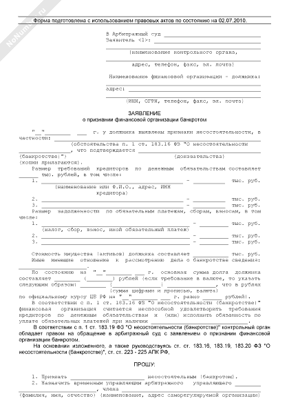 - 542Заявление контрольного органа о признании финансовой организации банкротом