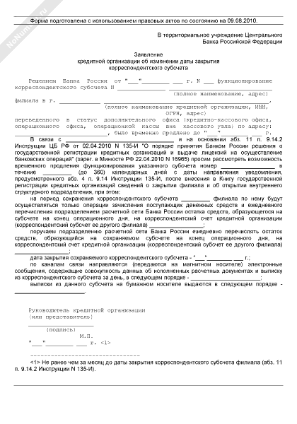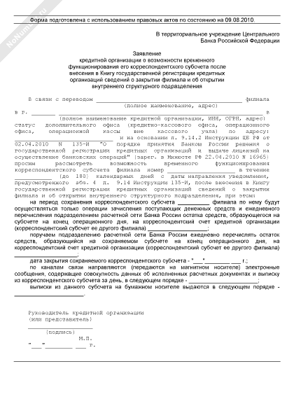 - 545Заявление кредитной организации о возможности временного функционирования его корреспондентского субсчета после внесения в Книгу государственной регистрации кредитных организаций сведений о закрытии филиала и об открытии внутреннего структурного подразделения