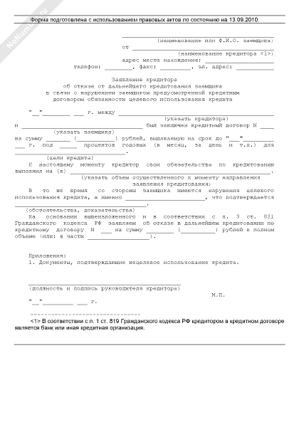 - 549Заявление кредитора об отказе от дальнейшего кредитования заемщика в связи с нарушением заемщиком предусмотренной кредитным договором обязанности целевого использования кредита