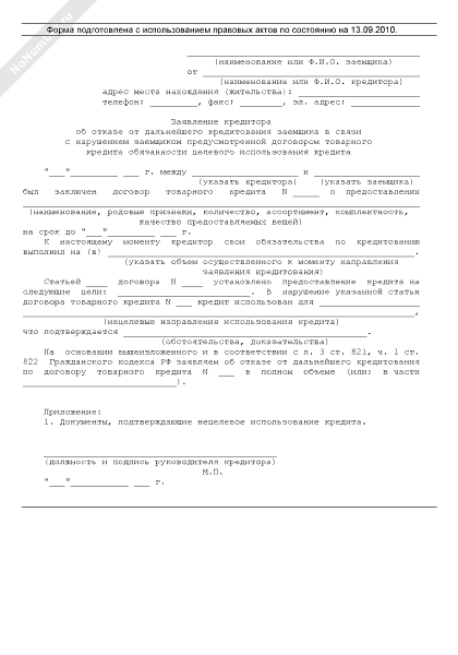 - 547Заявление кредитора об отказе от дальнейшего кредитования заемщика в связи с нарушением заемщиком предусмотренной договором товарного кредита обязанности целевого использования кредита