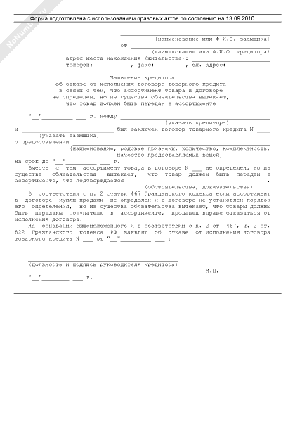 - 551Заявление кредитора об отказе от исполнения договора товарного кредита в связи с тем, что ассортимент товара в договоре не определен, но из существа обязательства вытекает, что товар должен быть передан в ассортименте