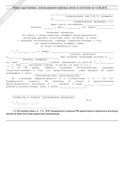 - 548Заявление кредитора об отказе в предоставлении заемщику предусмотренного договором кредита полностью/частично в связи с наличием обстоятельств, очевидно свидетельствующих о том, что предоставленная заемщику сумма не будет возвращена в срок