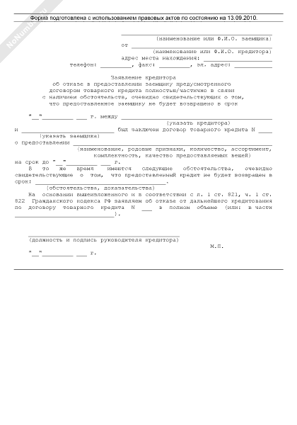 - 550Заявление кредитора об отказе в предоставлении заемщику предусмотренного договором товарного кредита полностью/частично в связи с наличием обстоятельств, очевидно свидетельствующих о том, что предоставленное заемщику не будет возвращено в срок