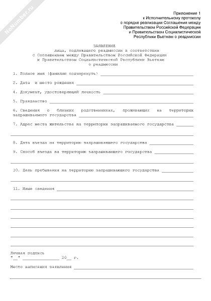 - 553Заявление лица, подлежащего реадмиссии в соответствии с Соглашением между Правительством Российской Федерации и Правительством Социалистической Республики Вьетнам о реадмиссии