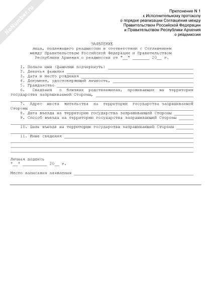 - 554Заявление лица, подлежащего реадмиссии в соответствии с Соглашением между Правительством Российской Федерации и Правительством Республики Армения о реадмиссии (приложение к исполнительному протоколу о порядке реализации Соглашения между Правительством Российской Федерации и Правительством Республики Армения о реадмиссии)