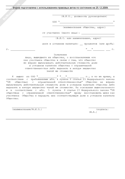 - 560Заявление лица, вышедшего из общества с ограниченной ответственностью, о восстановлении его как участника общества в связи с тем, что общество не вправе выплачивать действительную стоимость доли в уставном капитале общества либо выдавать в натуре имущество такой же стоимости