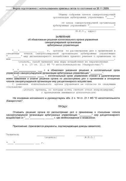 - 53Заявление арбитражного управляющего об обжаловании решения коллегиального органа управления саморегулируемой организации арбитражных управляющих