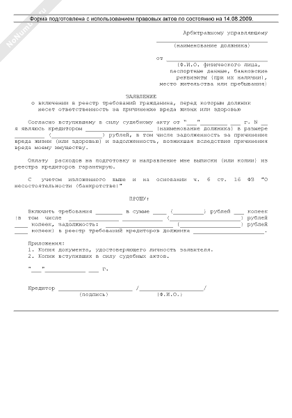 - 51Заявление арбитражному управляющему о включении в реестр требований гражданина, перед которым должник несет ответственность за причинение вреда жизни или здоровью