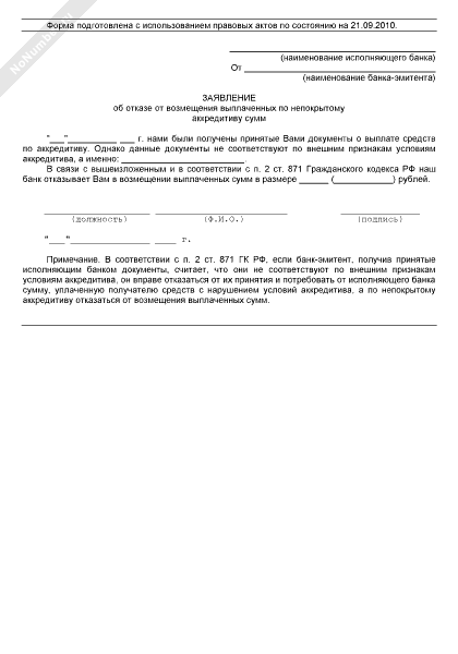 - 60Заявление банка-эмитента об отказе от возмещения выплаченных по непокрытому аккредитиву сумм в связи с получением документов, которые не соответствуют по внешним признакам условиям аккредитива