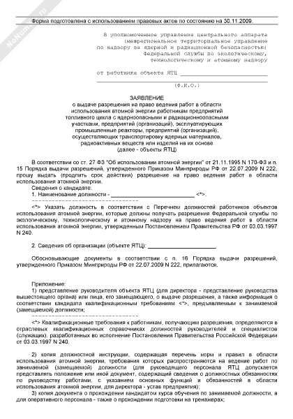 - 692Заявление на выдачу разрешения на право ведения работ в области использования атомной энергии работникам предприятий топливного цикла с ядерноопасными и радиационноопасными участками, предприятий (организаций), эксплуатирующих промышленные реакторы, предприятий (организаций), осуществляющих транспортировку ядерных материалов, радиоактивных веществ или изделий на их основе, или продление срока его действия