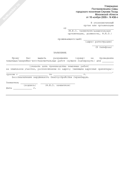 - 682Заявление на выдачу разрешения (ордера) на проведение земляных (аварийно-восстановительных) работ на территории городского поселения Сергиев Посад Московской области