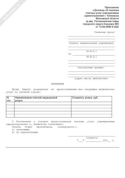 - 922Заявление на предоставление медицинских услуг на платной основе (приложение к договору об оказании платных услуг учреждениями здравоохранения города Климовска Московской области)