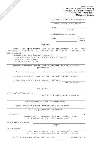 - 926Заявление на предоставление права приобретения коттеджа, строящегося на территории Московской области, по себестоимости