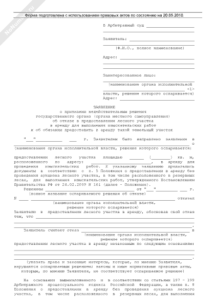- 99Заявление в арбитражный суд о признании недействительным решения государственного органа (органа местного самоуправления) об отказе в предоставлении лесного участка в аренду для выполнения изыскательских работ и об обязании предоставить в аренду такой земельный участок