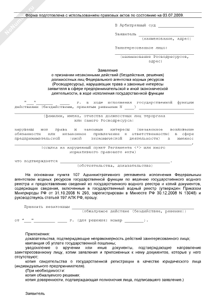 - 96Заявление в арбитражный суд о признании незаконными действий (бездействия, решения) должностных лиц Федерального агентства водных ресурсов (Росводресурсы), нарушающих права и законные интересы заявителя в сфере предпринимательской и иной экономической деятельности, в ходе исполнения государственной функции