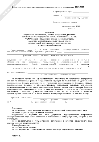 - 93Заявление в арбитражный суд о признании незаконными действий (бездействия, решения) должностных лиц Федеральной службы по финансовым рынкам (ФСФР России), нарушающих права и законные интересы заявителя в сфере предпринимательской и иной экономической деятельности, в ходе исполнения государственной функции