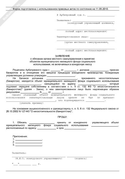 - 89Заявление в арбитражный суд об обязании органа местного самоуправления к принятию объектов муниципального жилищного фонда социального использования, не включаемых в конкурсную массу