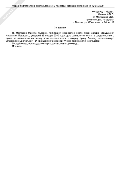 - 1126Заявление о включении в свидетельство о праве на наследство наследника, пропустившего срок для принятия наследства