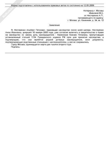- 1127Заявление о включении в свидетельство о праве на наследство наследника, пропустившего срок для принятия наследства и не подтвердившего факт родственных отношений с наследодателем