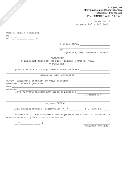 - 1139Заявление о внесении сведений об отце ребенка в запись акта о рождении (форма № 3)