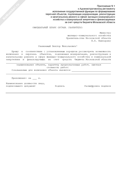 - 1137Заявление о внесении в перечень объектов, подлежащих модернизации, реконструкции и капитальному ремонту в сфере жилищно-коммунального хозяйства и коммунальной энергетики и финансируемых за счет средств бюджета Московской области