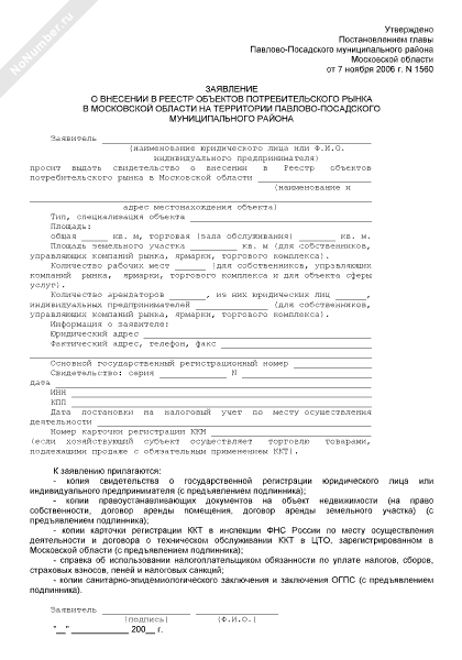 - 1136Заявление о внесении в Реестр объектов потребительского рынка в Московской области на территории Павлово-Посадского муниципального района Московской области
