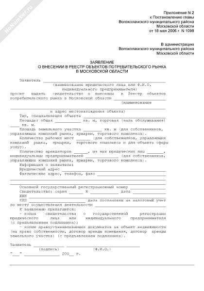 - 1133Заявление о внесении в реестр объектов потребительского рынка в Московской области, расположенного на территории Волоколамского муниципального района